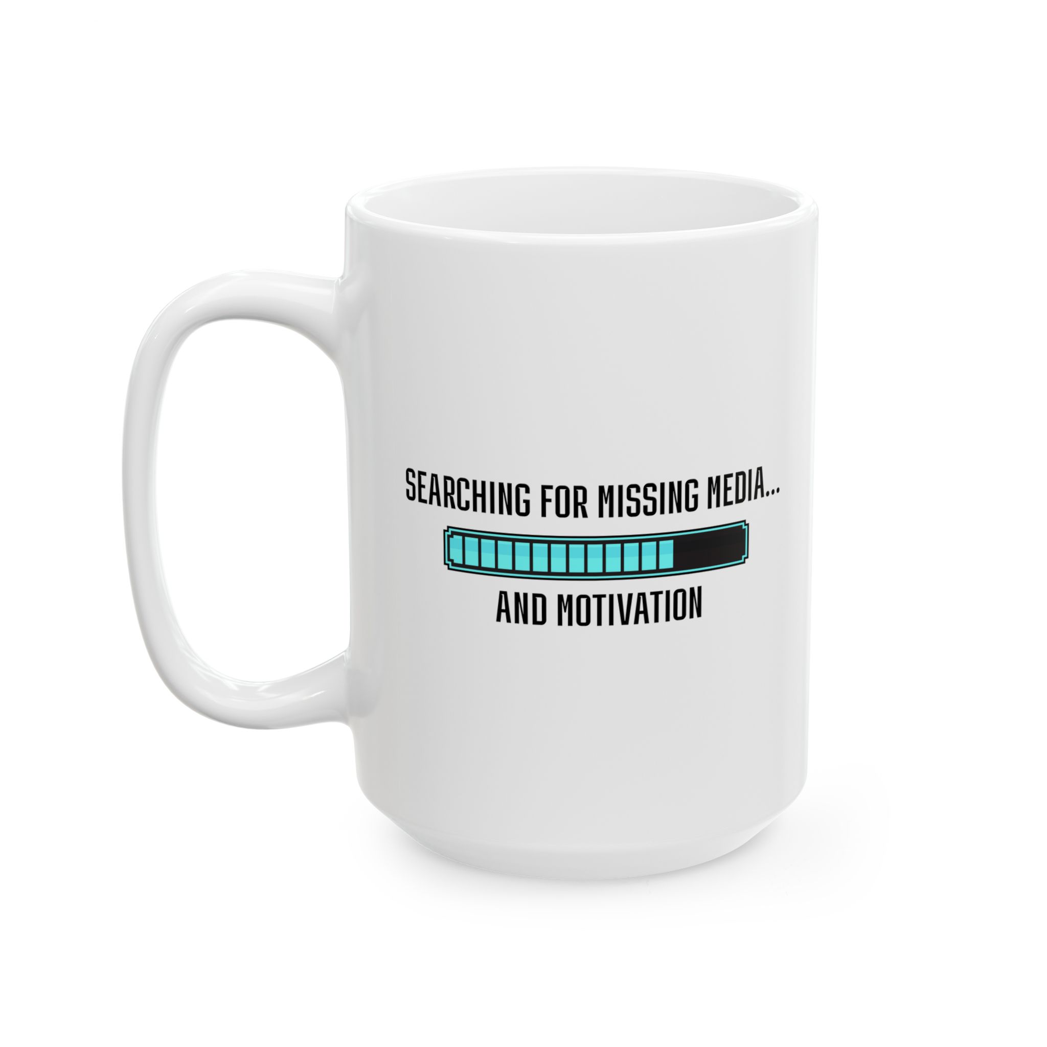 “Searching for missing media… and motivation” – the perfect design for every editor who’s ever faced the dreaded red screen of offline footage. This design features a loading bar that’s perpetually stuck at 99%, because we all know that last 1% is where the real drama happens.